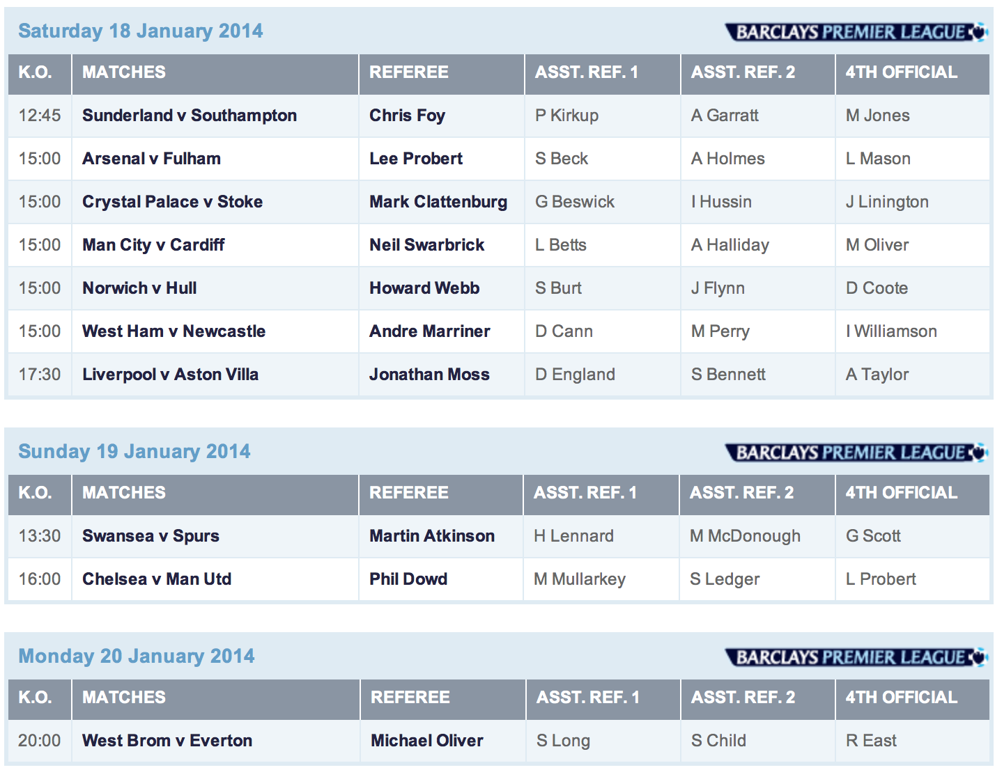 Mark Clattenburg has a tough one with Crystal Palace v. Stoke, mostly because everyone hates him. Stoke because he has history with Tony Pulis, and Palace because he awarded Tottenham a controversial penalty in their first game back in the top flight.