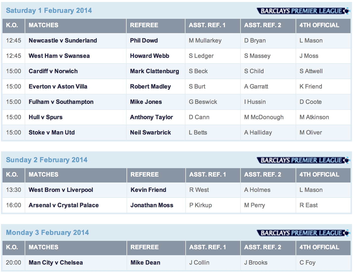 Elsewhere, Phil Dowd is managing the Anti-Mark Clattenburg Derby: Newcastle v. Sunderland. (Clatts is a lifelong Newcastle supporter and lives near Sunderland, so he can’t referee either team.)