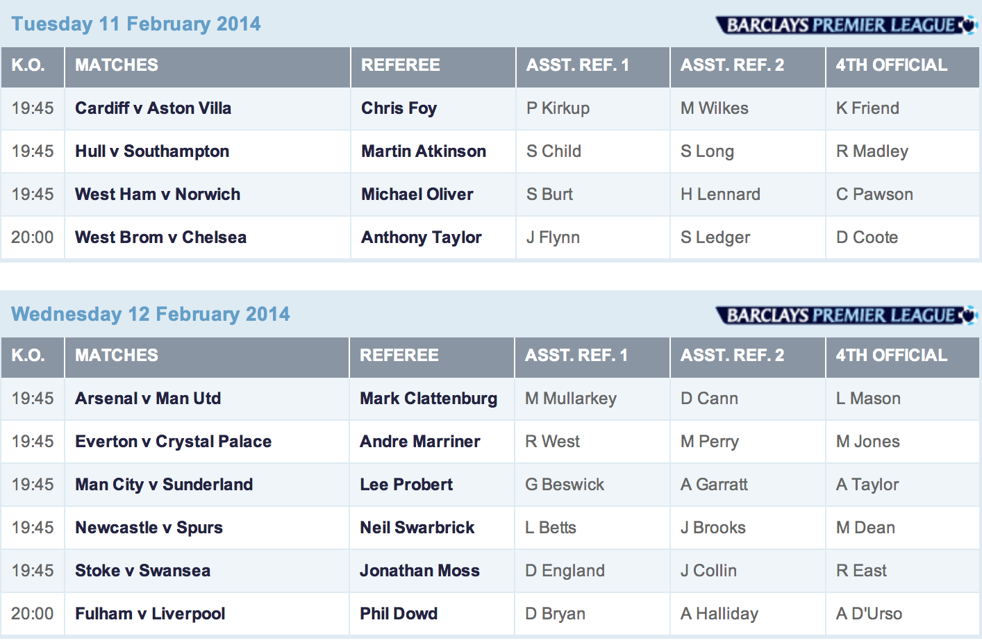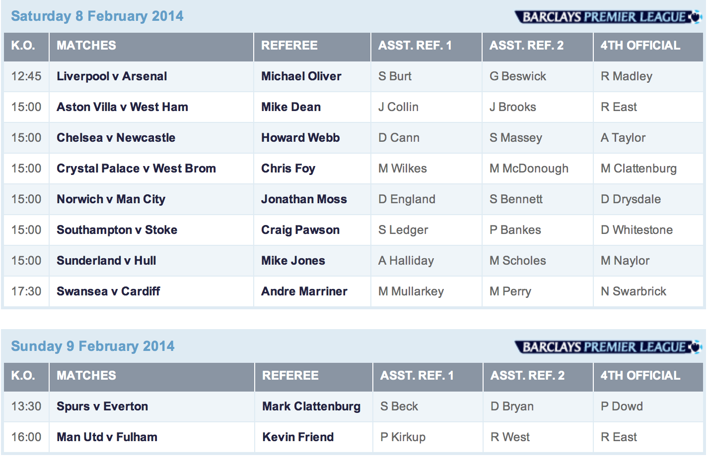 He’s got Everton (5th) at Spurs (6th) on Sunday, then takes a break and does Arsenal (1st) v. Man United (7th) on Wednesday.