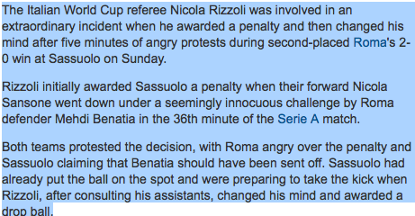 Sassuolo v. Roma was a prime example. It was a game of crying and begging and surrounding him at every turn. But one particular situation stood out: a penalty call in the 33rd-ish minute (I’ll explain the “ish” in a second). Here’s what Reuters had to say: