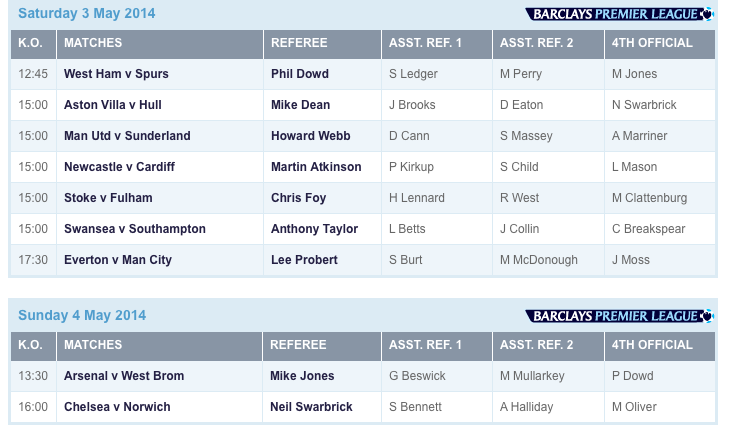 Lee Probert, who will referee the FA Cup Final on May 17, takes probably the biggest game: Everton v. Manchester City. Everton need to win to have even the faintest hope of Champions League; Manchester City have to win to win the title.