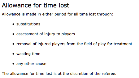 Some of the other situations laid out in Law 7 are pretty straight forward. Injuries or the assessment of injuries are counted from the time the stoppage occurs until play resumes, either because the player is fit or because he’s taken off the pitch.