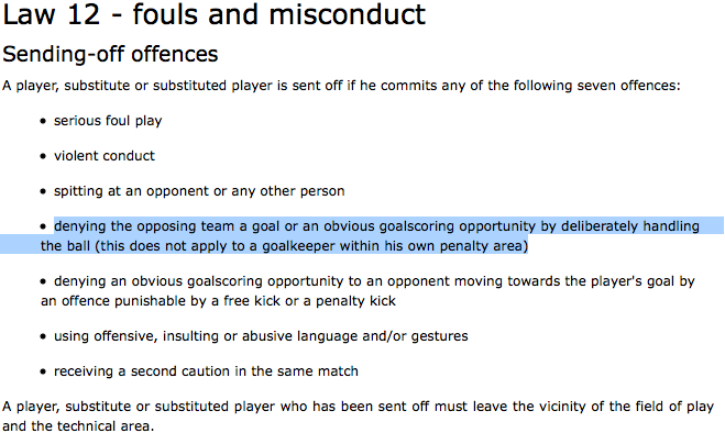 There’s not much wiggle room there. There’s no “common sense” test. There’s no option for the referee to give a yellow or a stern talking to (as was suggested it should be on Twitter). If the handball is deliberate (and he’d already said it was) and the handball prevented a goalscoring opportunity (which it did) the red card naturally has to follow.